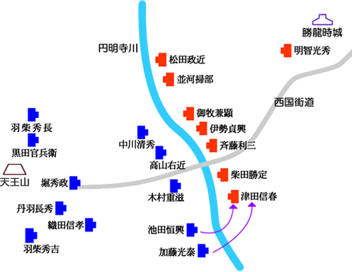 その後、池田恒興、加藤光泰らの部隊が川を渡って奇襲を行い、明智軍の側面を攻撃しました。